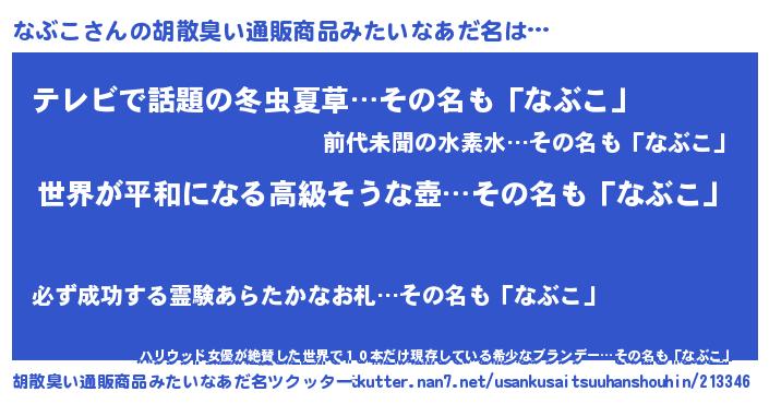 | ヘコむあだ名 | 『豆乳』『なぶこ(笑)』『なぶにゅー』 |
