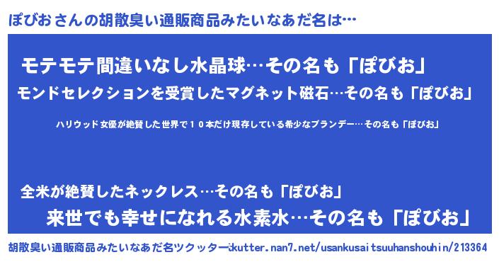 | 男性向けラノベタイトル風あだ名 | 『魔弾の王とぽびお』『ぽびおの憂鬱』 |