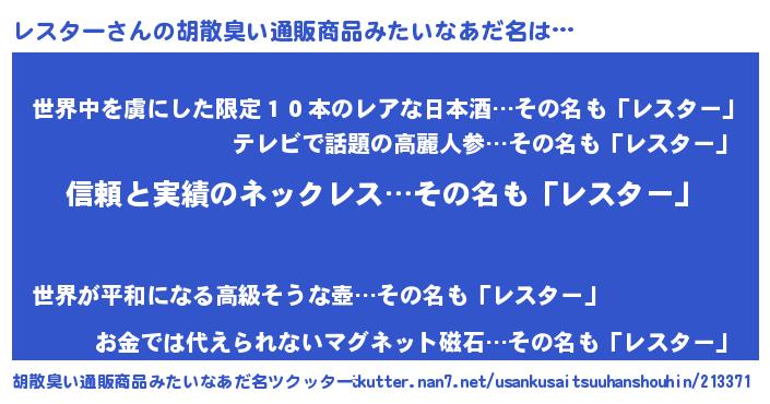 | 意味不明あだ名 | 『めかぶ科レスター属』『自称レスター』 |