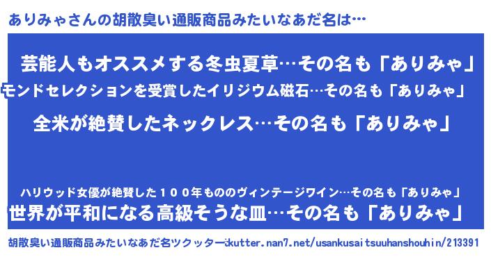 | 肩書あだ名 | 『ありみゃ艦長』『ありみゃ塾長』 |