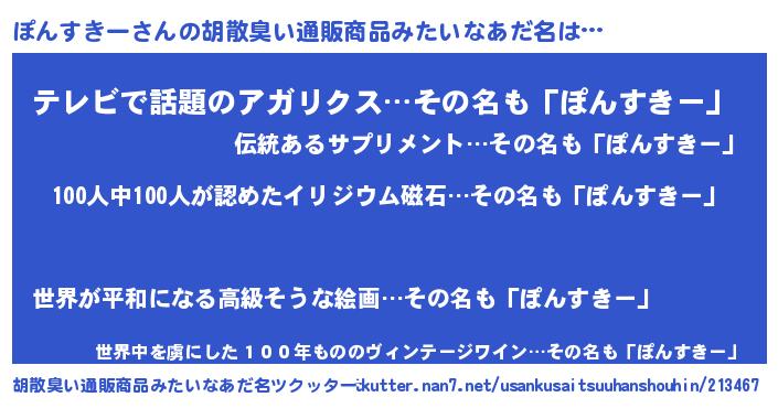 | 男性向けラノベタイトル風あだ名 | 『おまえをオタクにしてやるから、俺をぽんすきーにしてくれ! 』 |