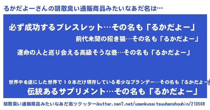 | 肩書あだ名 | 『るかだよー大統領』『るかだよー御曹司』 |