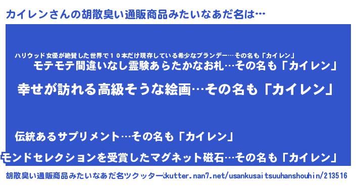 | 男性向けラノベタイトル風あだ名 | 『緋弾のカイレン』『魔弾の王とカイレン』 |