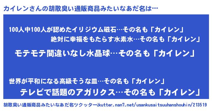 | 男性向けラノベタイトル風あだ名 | 『カイレンの憂鬱』『カイレンスレイヤー』 |