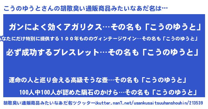 | 男性向けラノベタイトル風あだ名 | 『こうのゆうとの憂鬱』 |
