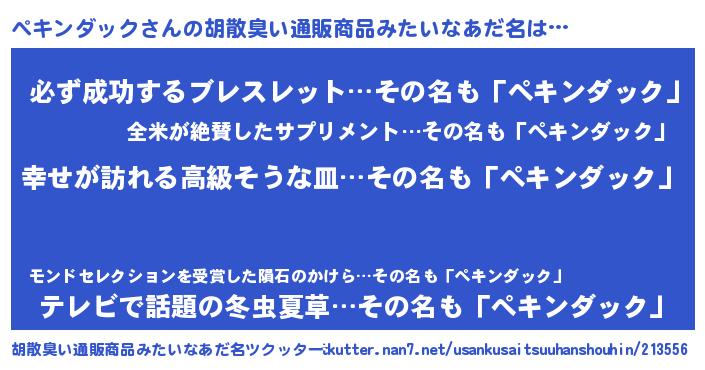 | 男性向けラノベタイトル風あだ名 | 『やはりぺキンダックの青春ラブコメはまちがっている 』 |
