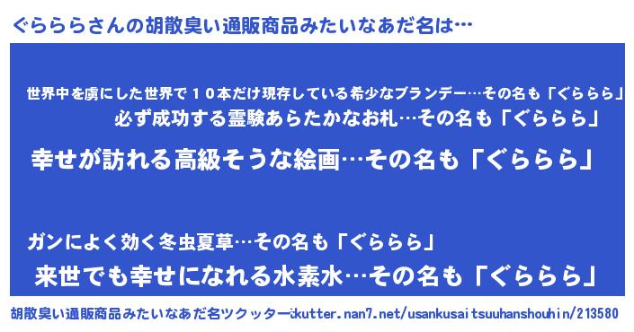 | 女子向けラノベタイトル風あだ名 | 『ぐらららの雑貨屋さん』 |