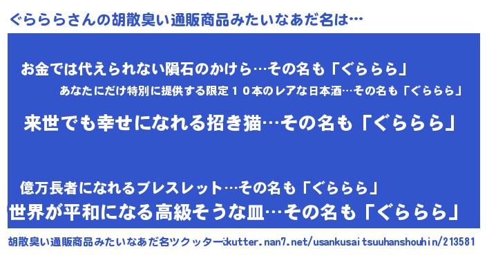 | 意味不明あだ名 | 『永久保存ぐららら』『ペロリンぐららら』 |