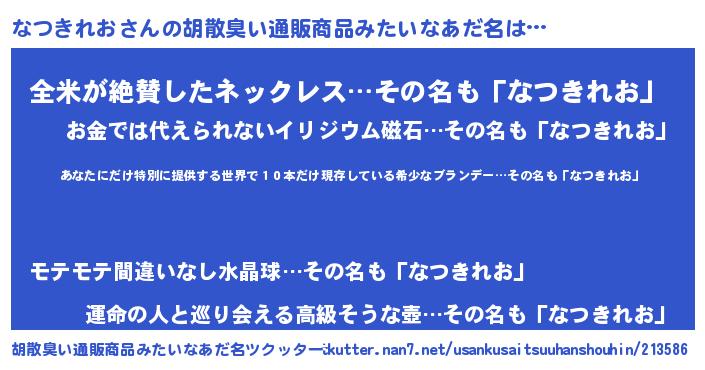 | 男性向けラノベタイトル風あだ名 | 『この素晴らしい世界になつきれおを!』 |