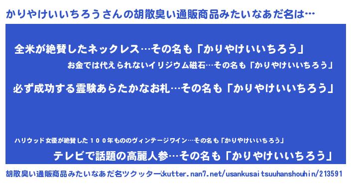 | 男性向けラノベタイトル風あだ名 | 『かりやけいいちろうの憂鬱』 |