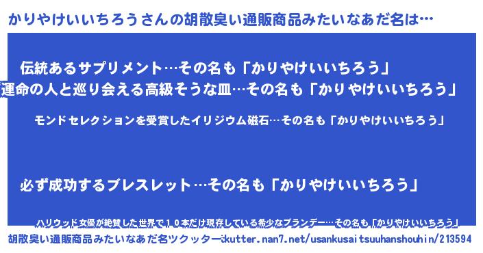 | 男性向けラノベタイトル風あだ名 | 『うちのかりやけいいちろうが世界を掌握している!』 |