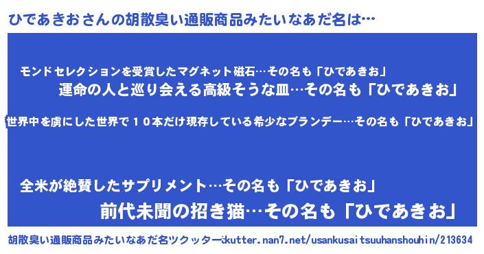 | 男性向けラノベタイトル風あだ名 | 『この素晴らしい世界にひであきおを!』 |