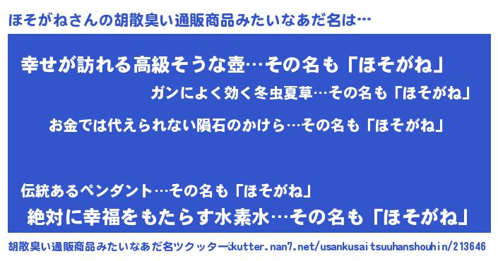 | ヘコむあだ名 | 『豆乳』『ほそがね(笑)』『ほそもー』 |
