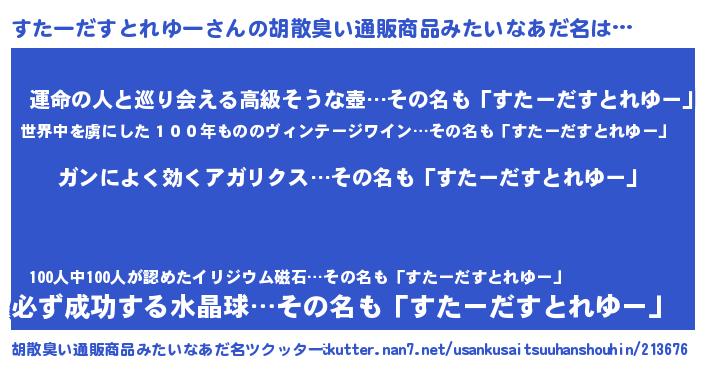 | 意味不明あだ名 | 『自称すたーだすとれゆー』 |