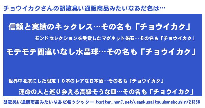 | 欧米人風あだ名 | 『マイケルチョウイカク』 |