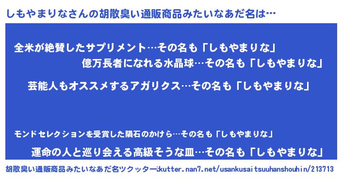 | 男性向けラノベタイトル風あだ名 | 『しもやまりなに滅ぼされるだけの簡単なお仕事です』 |