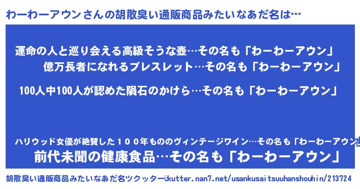 | 男性向けラノベタイトル風あだ名 | 『おまえをオタクにしてやるから、俺をわーわーアウンにしてくれ! 』 |