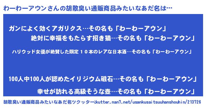 | 男性向けラノベタイトル風あだ名 | 『魔弾の王とわーわーアウン』 |