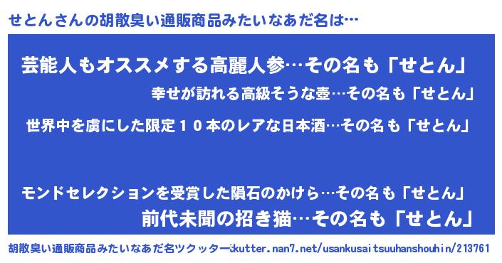 | 男性向けラノベタイトル風あだ名 | 『この素晴らしい世界にせとんを!』 |