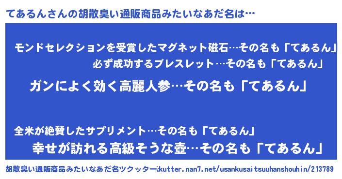| 意味不明あだ名 | 『自称てあるん』『ヨモギ科てあるん属』 |