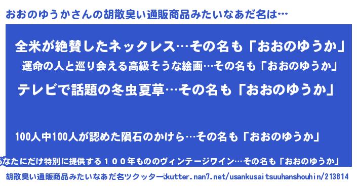 | 男性向けラノベタイトル風あだ名 | 『Re:おおのゆうかから始める異世界生活』 |