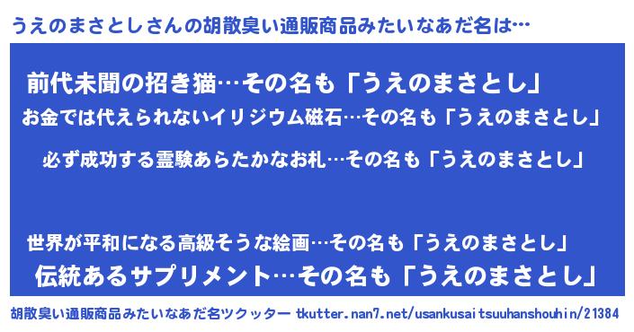 | ヘコむあだ名 | 『うえもー』『うえのまさとし(笑)』 |