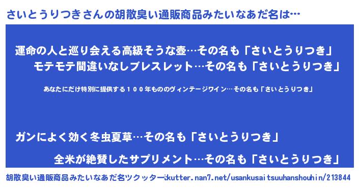 | 意味不明あだ名 | 『住所不定無職さいとうりつき(10歳)』 |