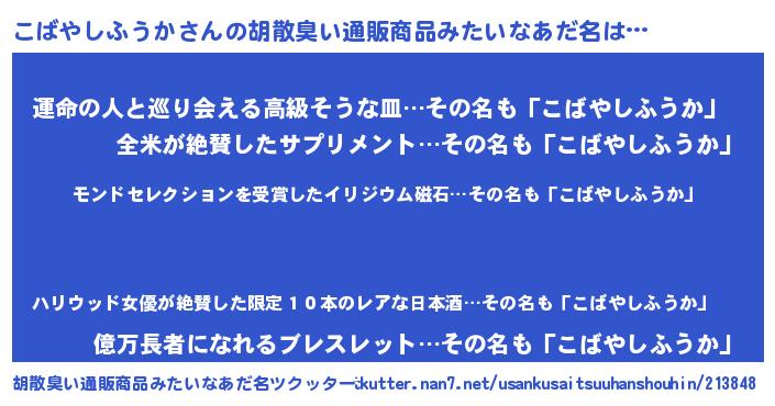 | 男性向けラノベタイトル風あだ名 | 『こばやしふうか~年齢イコール彼女いない歴の魔法使い~』 |