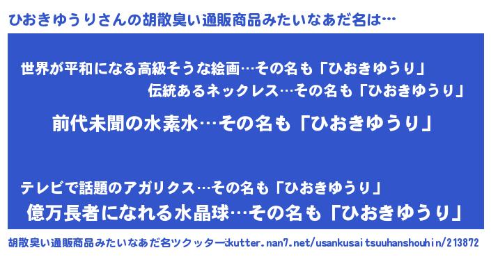 | ヘコむあだ名 | 『ひおきゆうり(震え声)』『豆乳』 |