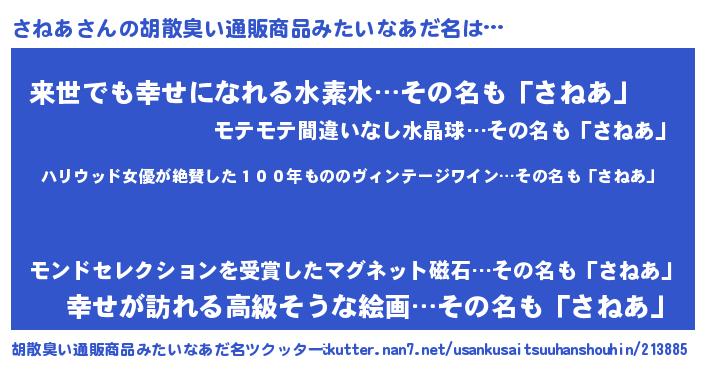 | ヘコむあだ名 | 『さねあ(笑)』『豆乳』『さねふぇ~』 |