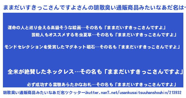 | 伝説のあだ名 | 『救世主となる技術者ままだいすきっこさんですよ』 |
