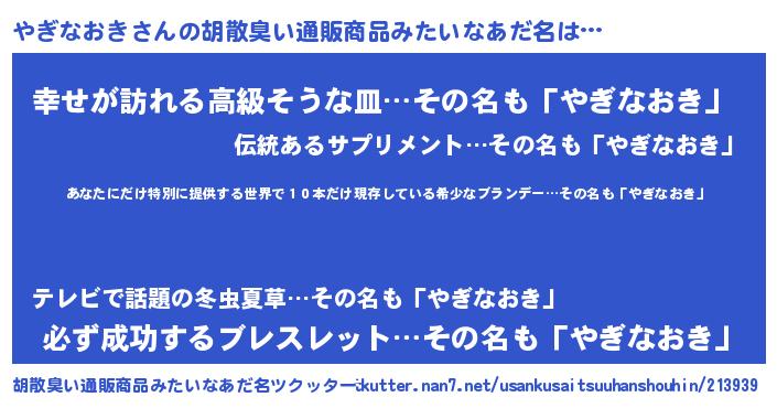 | 意味不明あだ名 | 『住所不定無職やぎなおき(98歳)』 |