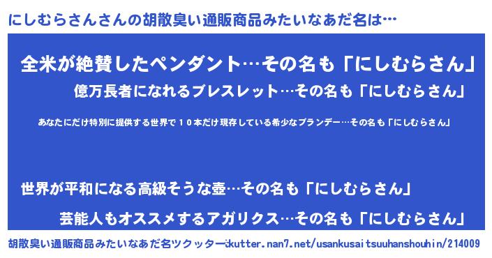 | 意味不明あだ名 | 『住所不定無職にしむらさん(91歳)』 |