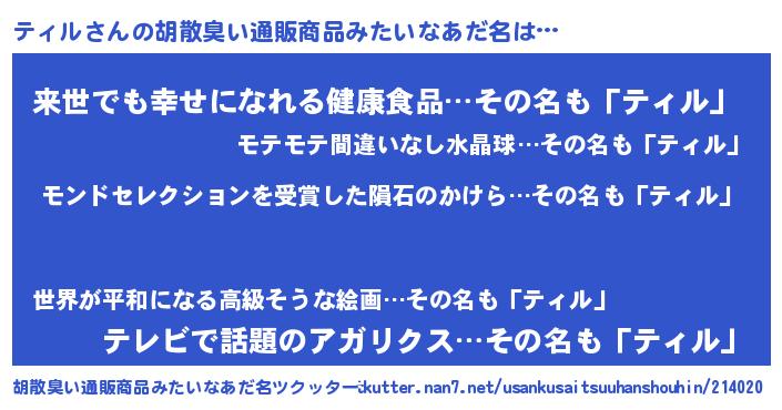 | ヘコむあだ名 | 『ティル(遠い目)』『ティもー』 |
