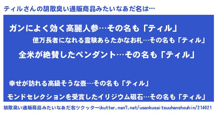 | 意味不明あだ名 | 『とにかく怪しいティル』『自称ティル』 |