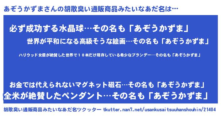 | 意味不明あだ名 | 『住所不定無職あぞうかずま(93歳)』 |