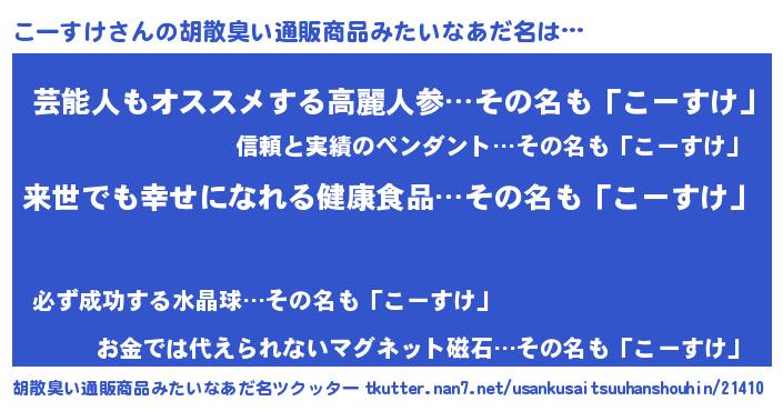 | 意味不明あだ名 | 『永久保存こーすけ』『自称こーすけ』 |