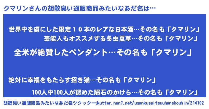 | 意味不明あだ名 | 『とにかく怪しいクマリン』 |