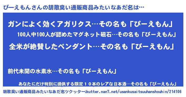 | 男性向けラノベタイトル風あだ名 | 『ぴーえもんの嫁は女の子じゃないと思った?』 |