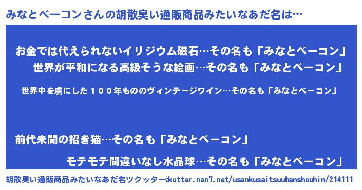 | 男性向けラノベタイトル風あだ名 | 『この素晴らしい世界にみなとベーコンを!』 |