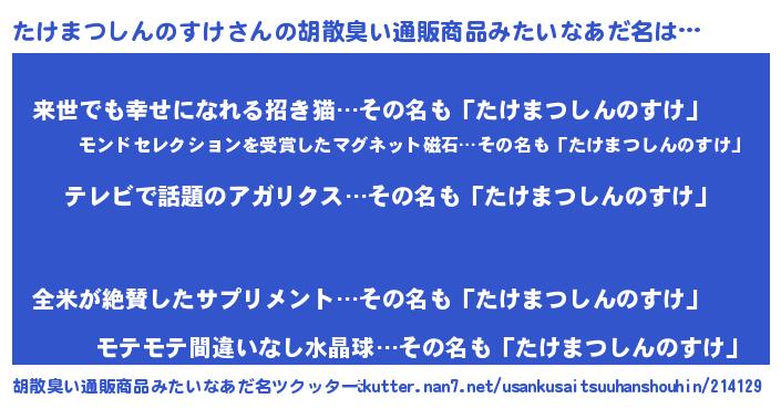 | ヘコむあだ名 | 『たけまつしんのすけ(笑)』『たけにー』 |