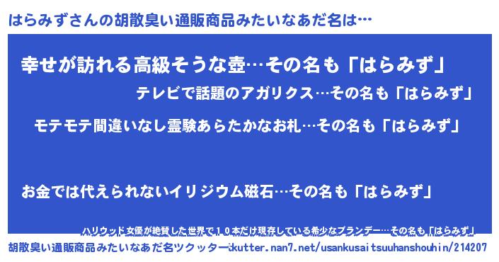 | ヘコむあだ名 | 『はらもー』『牛乳』『はらみず(笑)』 |