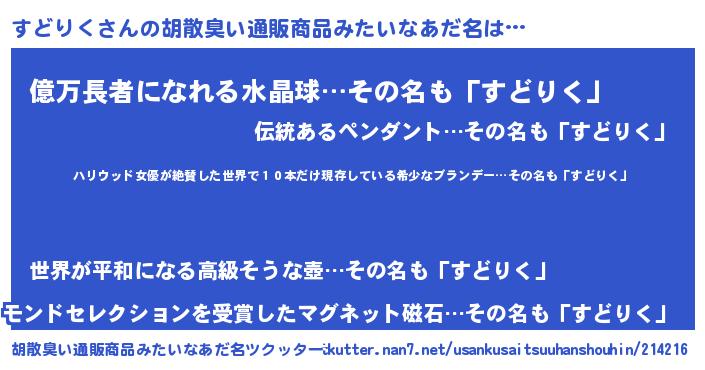 | 意味不明あだ名 | 『住所不定無職すどりく(91歳)』 |