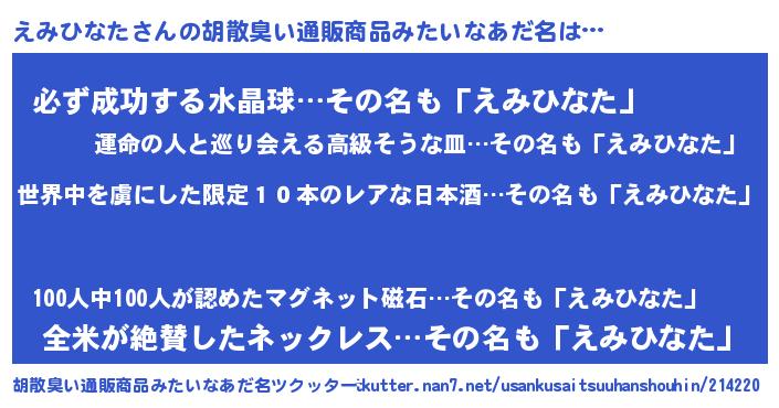 | 意味不明あだ名 | 『住所不定無職えみひなた(56歳)』 |