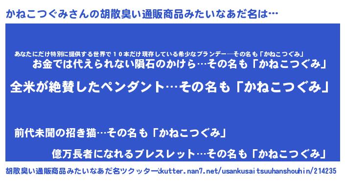 | 男性向けラノベタイトル風あだ名 | 『かねこつぐみの嫁は女の子じゃないと思った?』 |