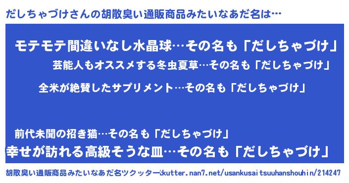 | 意味不明あだ名 | 『とにかく怪しいだしちゃづけ』 |