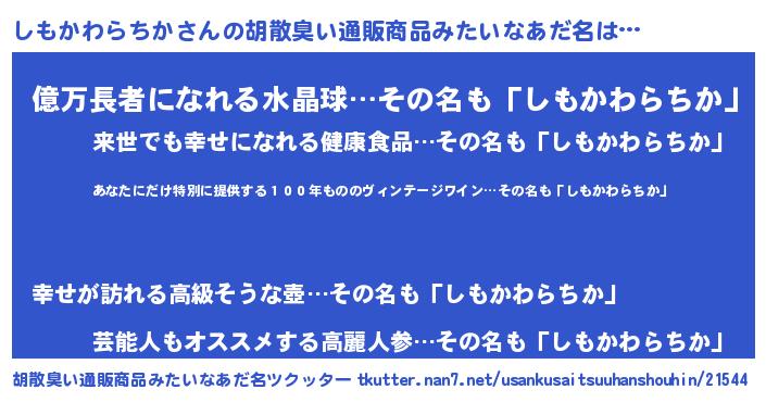 | 意味不明あだ名 | 『住所不定無職しもかわらちか(12歳)』 |