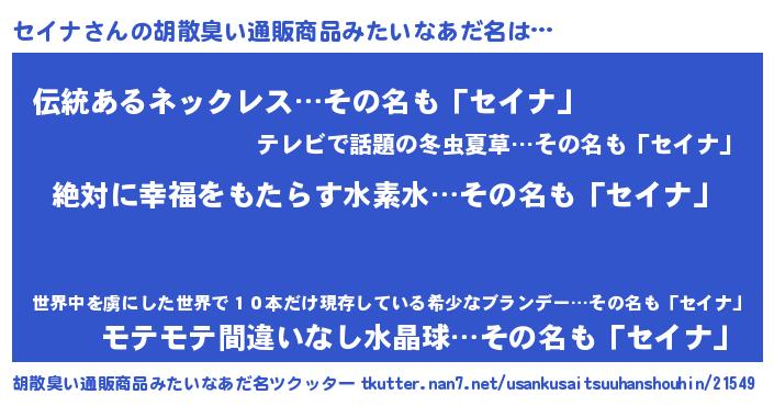| 男性向けラノベタイトル風あだ名 | 『セイナという概念が存在しない退屈な世界 』 |