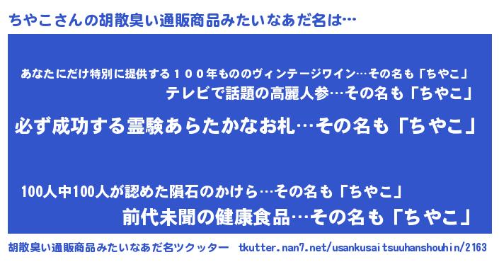 | 男性向けラノベタイトル風あだ名 | 『ちやこの憂鬱』 |
