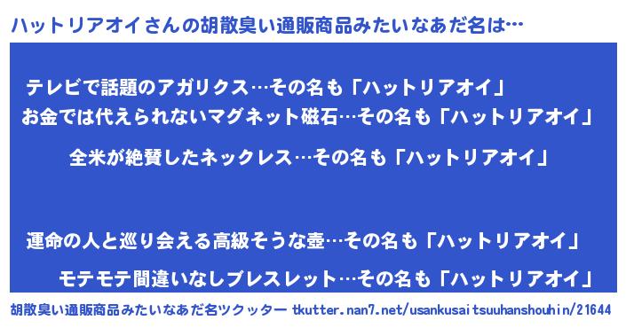 | 男性向けラノベタイトル風あだ名 | 『ハットリアオイの嫁は女の子じゃないと思った?』 |